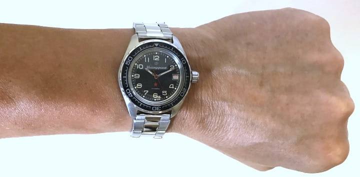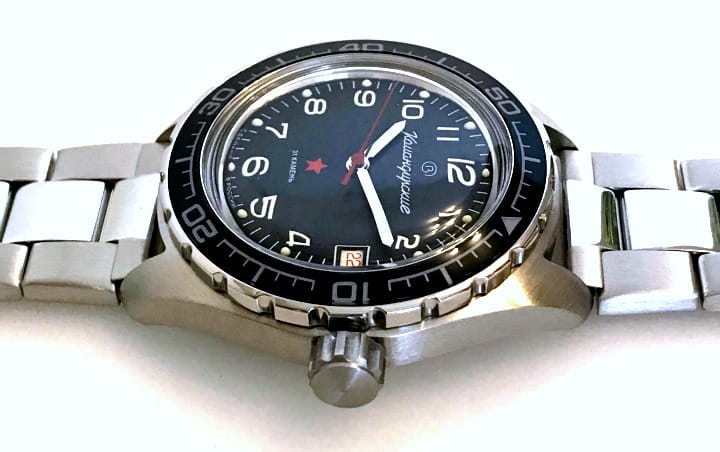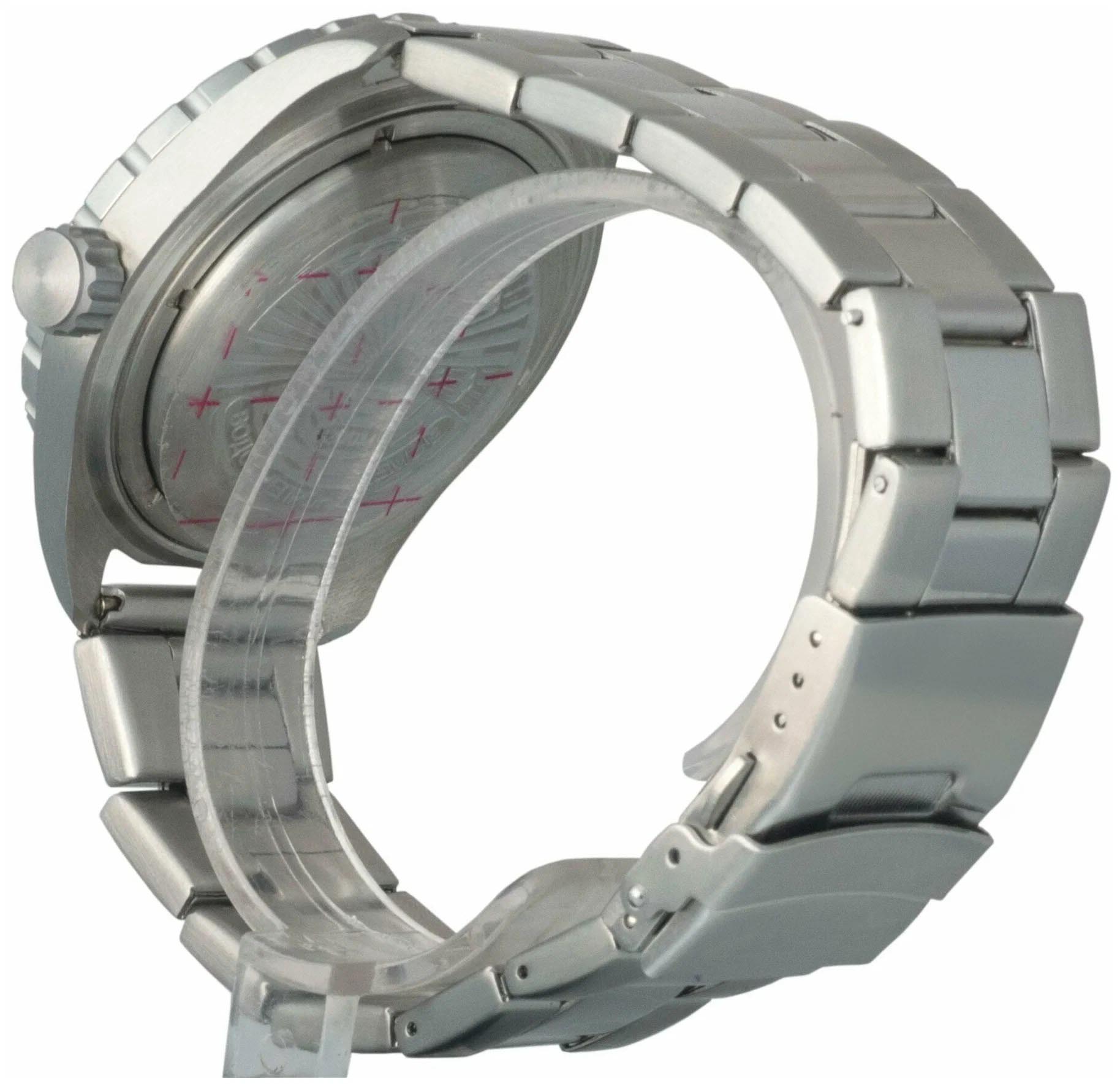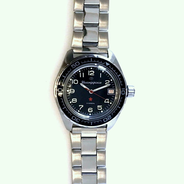 Мужские российские механические наручные часы Восток Командирские 020706, механический механизм (автоматический калибр) с высокой точностью. Класс водозащиты: 200 метров, позволит плавать, нырять и заниматься другими водными видами спорта. Стрелки с люминесцентным покрытиемЛюминесцентное покрытиеПозволяет считывать показания времени в темноте. Производители наносят на стрелки, часовые индексы, безель или поверхность циферблата светонакопительный состав, дающий холодное свечение.. Вращающийся безельБезельВнешний ободок, закрепляющий стекло. В спортивных часах так называется поворотное кольцо с делениями на циферблате, выполняет роль таймера – замеряет отрезки времени на шкале. Неподвижный безель – элемент декора. Однонаправленно вращающийся безель на дайверских часах позволяет фиксировать моменты погружения и выныривания на поверхность. из нержавеющей стали с PVDPVDУльтратонкое покрытие наносится в технике вакуумного напыления, сочетает в себе нитрид титана особой прочности со слоем золота или оксида хрома. Несёт в себе декоративную или защитную функцию. покрытием. Окошко даты находится в положении 3 часа. Автоподзавод с предохранительным устройством от перезаводки пружины. Частота: 19800 полуколебаний/час. Браслет с раскладной застёжкойРаскладная застёжкаТакой тип застёжки используется только на браслетах из металла. Она никогда не раскрывается полностью, происходит разделение на 2 и более частей. Раскладывающая застёжка снизит вероятность потери часов к минимуму..
