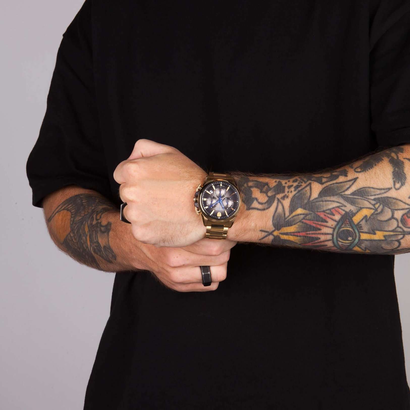 Швейцарские мужские кварцевые часы-хронограф Wainer WA.16100-D с механизмом калибра Ronda 5030.D станут идеальным выбором для ценителей стильных и практичных аксессуаров. Корпус из нержавеющей стали 316L с частичным PVD-покрытиемPVDУльтратонкое покрытие наносится в технике вакуумного напыления, сочетает в себе нитрид титана особой прочности со слоем золота или оксида хрома. Несёт в себе декоративную или защитную функцию. диаметром 44 мм и толщиной 11 мм защищен прочным сапфировым стекломСапфировое стеклоПрочный и надёжный материал из кристалла сапфира синтетического происхождения, характеризующийся особой твёрдостью и устойчивостью к царапинам и повреждениям., устойчивым к царапинам и механическим повреждениям. Циферблат с метками в виде штрихов оснащен окошком даты между 4 и 5 часами, а указатель дня недели вынесен на отдельный циферблат. Рифленая заводная головка с защитой обеспечивает дополнительную надежность механизма. Модель имеет класс водозащиты 100 метров, позволит плавать, нырять и заниматься другими водными видами спорта. Часы комплектуются стальным браслетом из нержавеющей стали 316L на раскладной застёжкеРаскладная застёжкаТакой тип застёжки используется только на браслетах из металла. Она никогда не раскрывается полностью, происходит разделение на 2 и более частей. Раскладывающая застёжка снизит вероятность потери часов к минимуму.. Функциональные возможности включают хронограф, секундомер и вынесенную секундную стрелку. Модель станет превосходным выбором для мужчин, ценящих надежность швейцарского качества и современный дизайн.