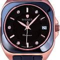 Женские кварцевые часы Wainer — это элегантный аксессуар, воплощающий швейцарское качество и изысканный дизайн. Модель выполнена в квадратной форме из стали с PVD-покрытиемPVDУльтратонкое покрытие наносится в технике вакуумного напыления, сочетает в себе нитрид титана особой прочности со слоем золота или оксида хрома. Несёт в себе декоративную или защитную функцию. розового цвета и керамической вставкой, что придаёт ей прочность и устойчивость к царапинам. Циферблат чёрного цвета гильоширован в зоне меток и дополнен логотипом бренда, а его поверхность украшена штриховыми и точечными элементами с люминесцентным покрытиемЛюминесцентное покрытиеПозволяет считывать показания времени в темноте. Производители наносят на стрелки, часовые индексы, безель или поверхность циферблата светонакопительный состав, дающий холодное свечение. и фианитами, что делает его привлекательным и выразительным. Секундная стрелка на конце декорирована буквой W, а рифлёная заводная головка с защитой оснащена фирменным логотипом, подчёркивая внимание к деталям. Защиту циферблата обеспечивает сапфировое стеклоСапфировое стеклоПрочный и надёжный материал из кристалла сапфира синтетического происхождения, характеризующийся особой твёрдостью и устойчивостью к царапинам и повреждениям., устойчивое к повреждениям и обеспечивающее чёткую видимость показаний при любом освещении. Керамический браслет шириной 16 мм гармонично сочетается с корпусом и добавляет модели изысканности. Часы водонепроницаемы до 30 метров (, что позволяет использовать их при мытье рук или под лёгким дождём. Механизм калибра Ronda 705 гарантирует точность хода и надёжность. Эти часы станут универсальным аксессуаром для тех, кто ценит сочетание стиля, функциональности и швейцарского мастерства — идеальный выбор для повседневной носки и торжественных случаев.