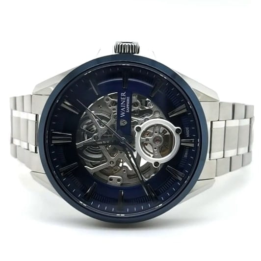 Модель Wainer WA.25511-B сочетает элегантность, швейцарское качество и техническое совершенство. Корпус диаметром 46 мм выполнен из нержавеющей стали 316L с безельБезельВнешний ободок, закрепляющий стекло. В спортивных часах так называется поворотное кольцо с делениями на циферблате, выполняет роль таймера – замеряет отрезки времени на шкале. Неподвижный безель – элемент декора. Однонаправленно вращающийся безель на дайверских часах позволяет фиксировать моменты погружения и выныривания на поверхность. с PVD-покрытиемPVDУльтратонкое покрытие наносится в технике вакуумного напыления, сочетает в себе нитрид титана особой прочности со слоем золота или оксида хрома. Несёт в себе декоративную или защитную функцию., обеспечивая прочность и долговечность. Скелетонизированный циферблат раскрывает сложность автоматического механизма Landeron Depa DP2072, а сапфировое стеклоСапфировое стеклоПрочный и надёжный материал из кристалла сапфира синтетического происхождения, характеризующийся особой твёрдостью и устойчивостью к царапинам и повреждениям. защищает дисплей от царапин и механических повреждений. Прозрачная задняя крышка подчеркивает эстетику работы механизма, а браслет из нержавеющей стали 316L на застёжке-бабочке с кнопкамиЗастёжка "бабочка"Такой вид застёжки дополняется предохранителями, помогающими избежать случайного раскрытия браслета. Обладают изящным исполнением. гарантирует надежную фиксацию и комфортное ношение. Водонепроницаемость до 50 метров защищает часы от случайных брызг и дождя. Wainer WA.25511-B — это стильный аксессуар для мужчин, ценящих швейцарское качество, современный дизайн и мастерство часового искусства.